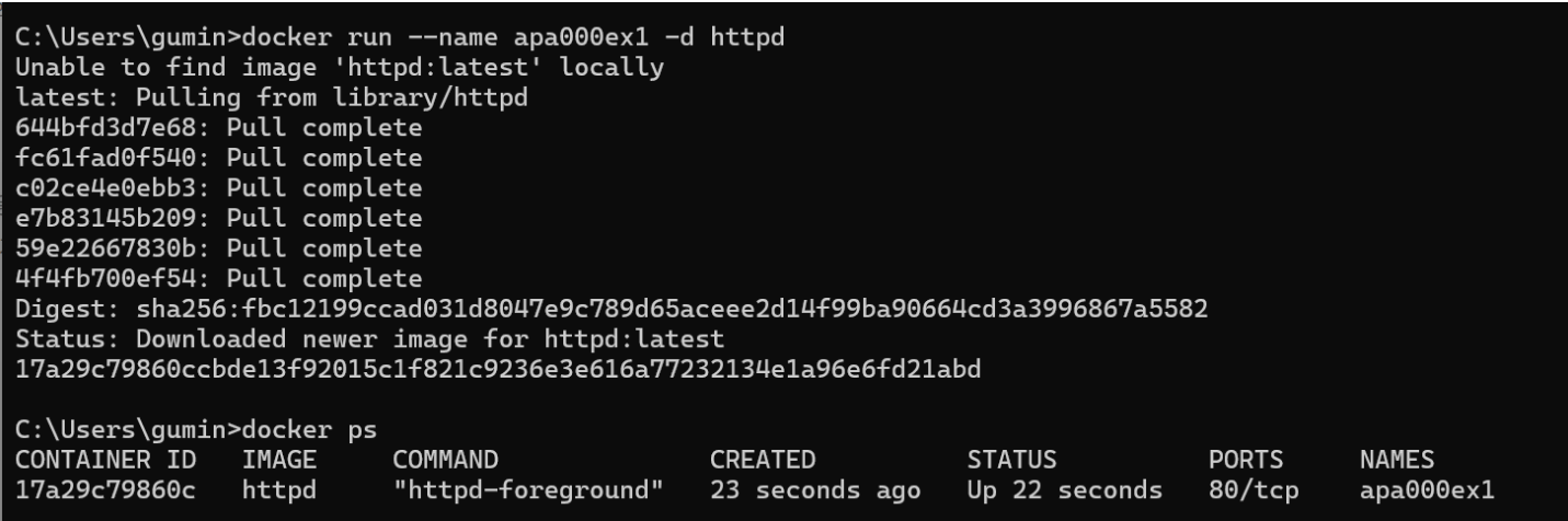 이미 앞선 예제에서 httpd 이미지를 내려받았으므로 이번에는 pull과 관련된 정보는 출력되지 않는다. 실행 결과에 출력되는 무작위 문자열은 컨테이너 ID이므로 실행할 때마다 달라진다.