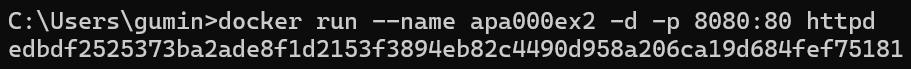 먼저 docker run --name apa000ex2 -d -p 8080:80 httpd를 이용해 컨테이너를 생성하고 포트를 포워딩해보겠다.