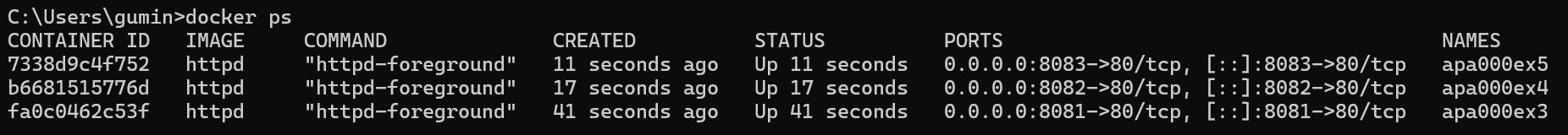 생성 후 docker ps로 목록을 다 볼 수 있다. 이제 http://localhost:8081~8083을 입력하면 아파치 초기 화면이 나타나는지 확인한다.