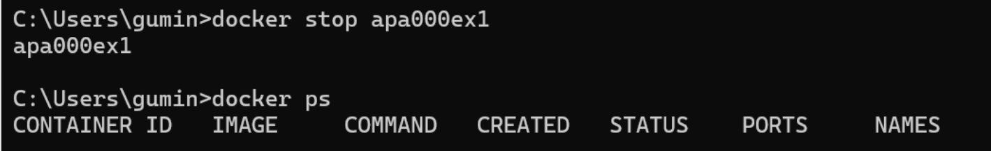 docker stop apa000ex1으로 컨테이너를 종료한 걸 볼 수 있다.