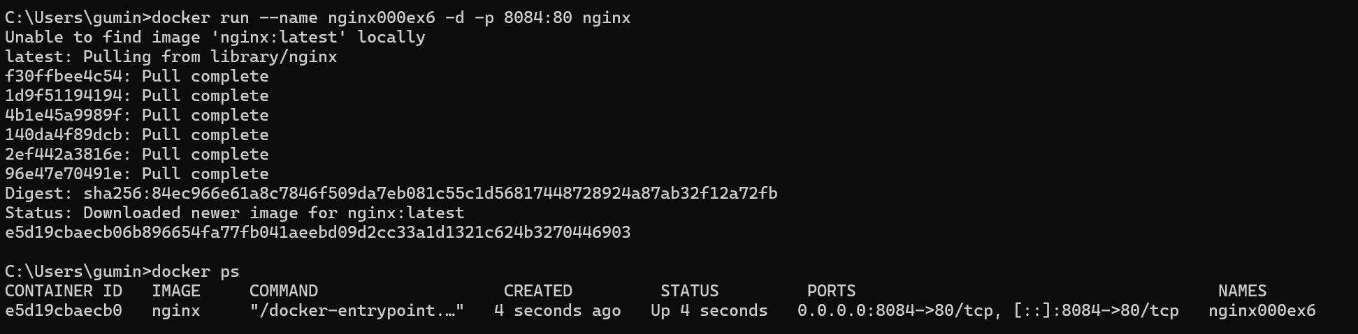docker run --name nginx000ex6 -d -p 8084:80 nginx를 이용해 이미지를 pull 받아와서 실행할 수 있다.