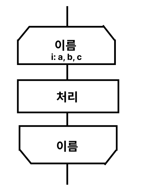 - 미리 정의된 처리 : 서브루틴 및 모듈 등 다른 곳에서 이미 정의된 하나 이상의 연산 또는 여러 개의 명령어로 이루어진 처리를 나타낸다.
