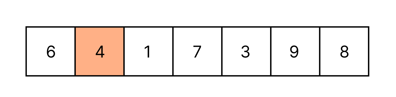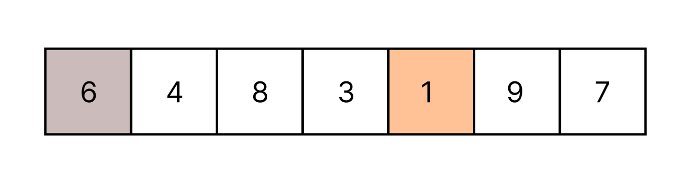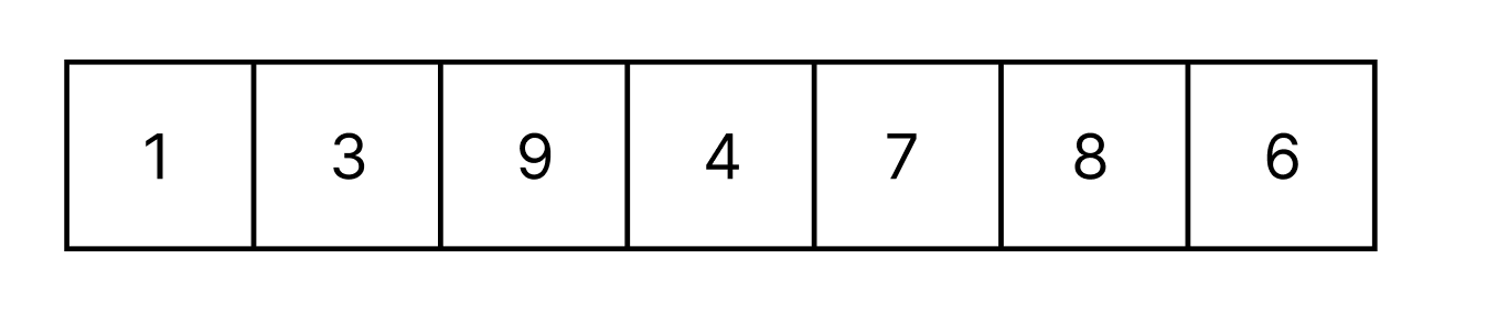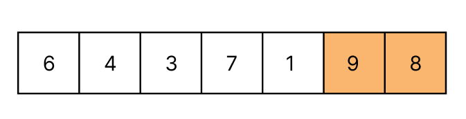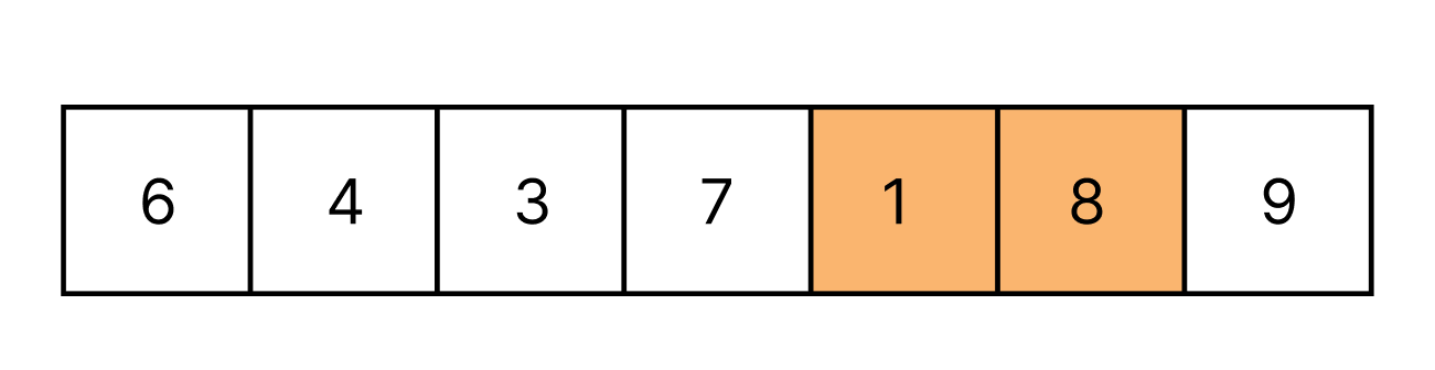 먼저 끝에 있는 두 요소 9와 8부터 시작을 한다. 이때 배열을 오름차순으로 정렬하고자 한다면 왼쪽 값이 오른쪽 값보다 작으면 된다. 9와 8을 비교했을 때 9보다 8이 더 작으므로 교환이 된다.
