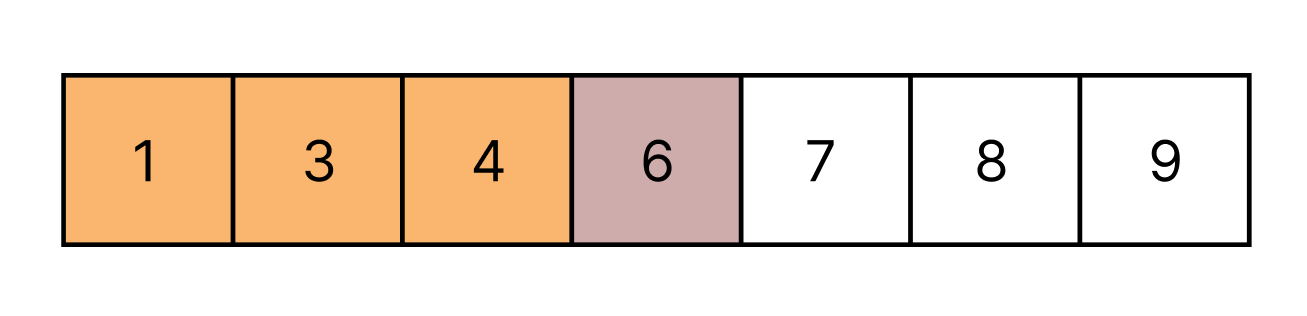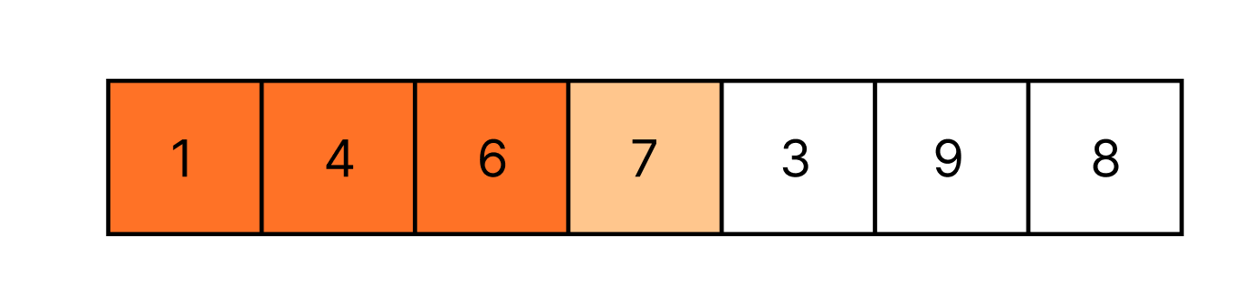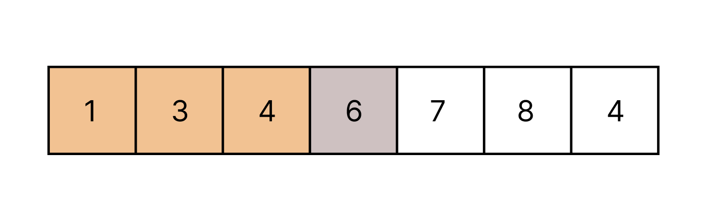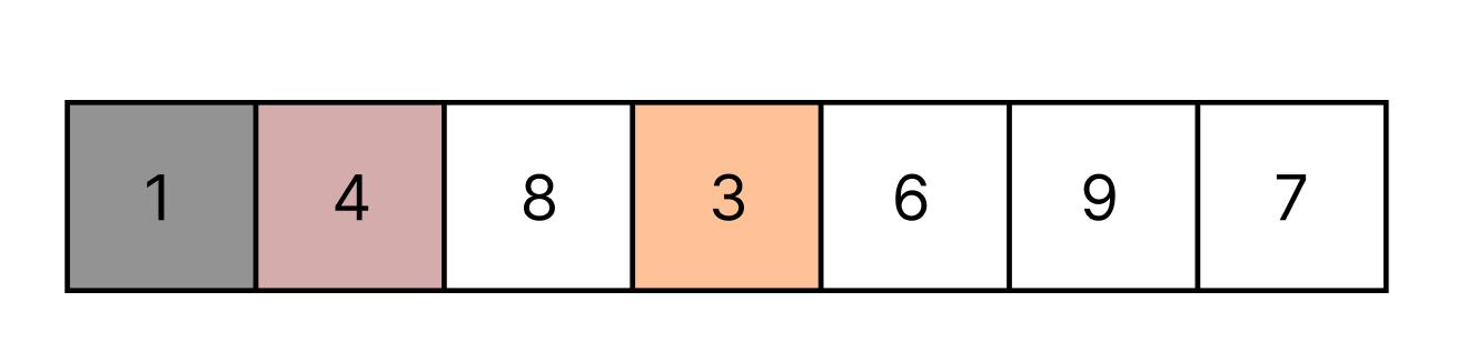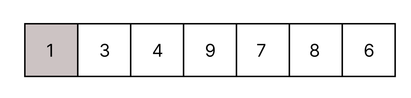 위 배열에서 첫 번째 패스(첫 번째 배열 정렬)이 지나면 아래와 같이 되는데 {1, 3, 4}는 정렬된 상태이므로 각 패스에서 비교, 교환을 하다가 어떤 시점 이후에 교환하지 않는다면 그보다 앞쪽의 요소는 이미 정렬을 마친 상태로 봐도 된다. 따라서 두 번째 패스는 첫 요소를 제외한 6개 요소가 아니라 4개 요소를 비교, 교환하면 더 빠르게 비교 교환하면서 정렬할 수 있게 된다.