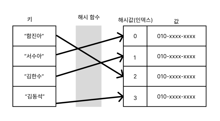 전화번호는 값이고 값을 검색하기 위해 활용하는 정보는 키이다. 그리고 그 사이에 키를 이용해 해시값 또는 인덱스로 변환하는 해시 함수가 있다. 해시 함수는 키를 일정한 해시값으로 변환시켜 값을 찾을 수 있게 해준다.