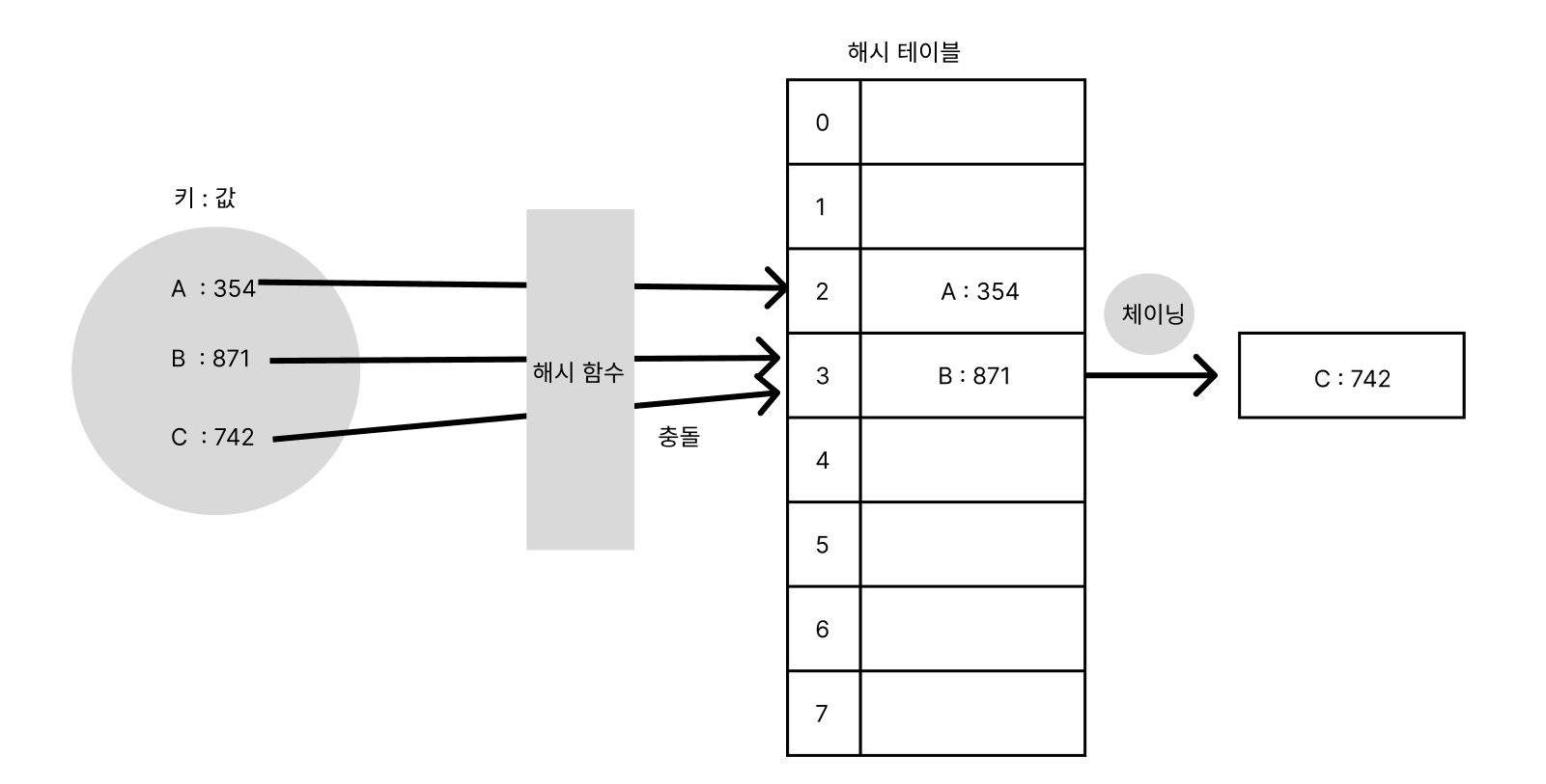 체이닝은 해시 테이블에 데이터를 저장할 때 해싱한 값이 같은 경우 충돌을 해결하는 간단한 방법이다. 체이닝은 충돌이 발생하면 해당 버킷에 링크드리스트로 같은 해시값을 가지는 데이터를 연결한다.