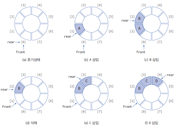 이렇게 그림처럼 큐를 구현하면 프런트값과 리어값을 업데이트 하면서 인큐와 디큐를 수행하기 때문에 선형 큐에서 발생한 요소 이동 문제를 해결할 수 있다. 물론 처리의 복잡도는 O(1)이다.