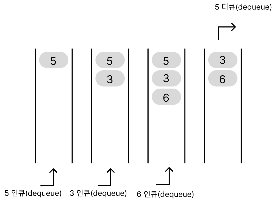 큐 : 스택과 마찬가지로 데이터를 일시적으로 쌓아 놓는 자료구조. 하지만 스택과는 다르게 FIFO 구조(First In First Out) 선입선출 구조이다.